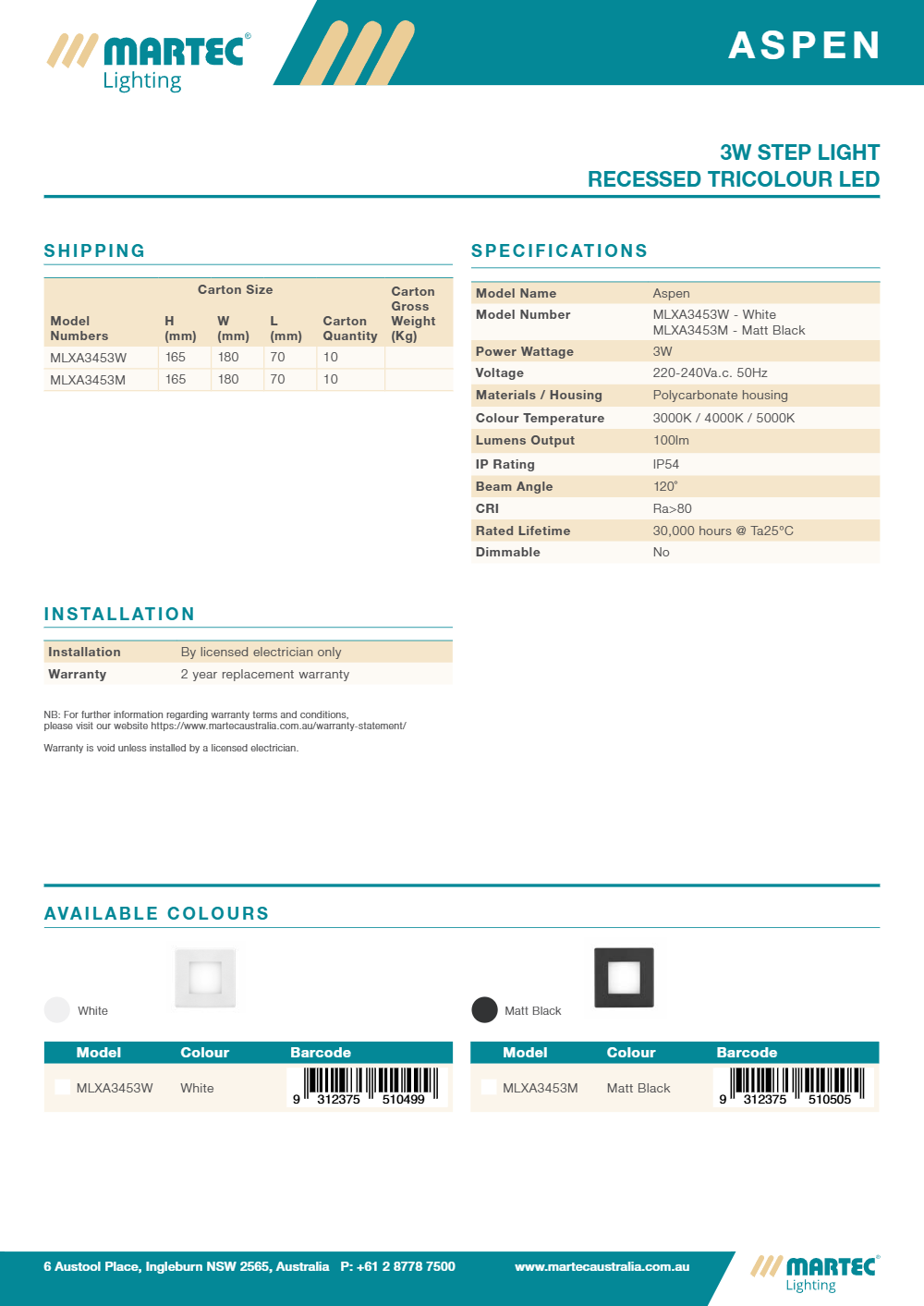 Equipped with tricolour switchable technology (3000K warm white, 4000K neutral white, 5000K cool white), the Aspen allows you to customise the lighting tone to suit your environment. Perfect for staircases, hallways, and pathways, this step light enhances visibility while adding a touch of modern elegance.