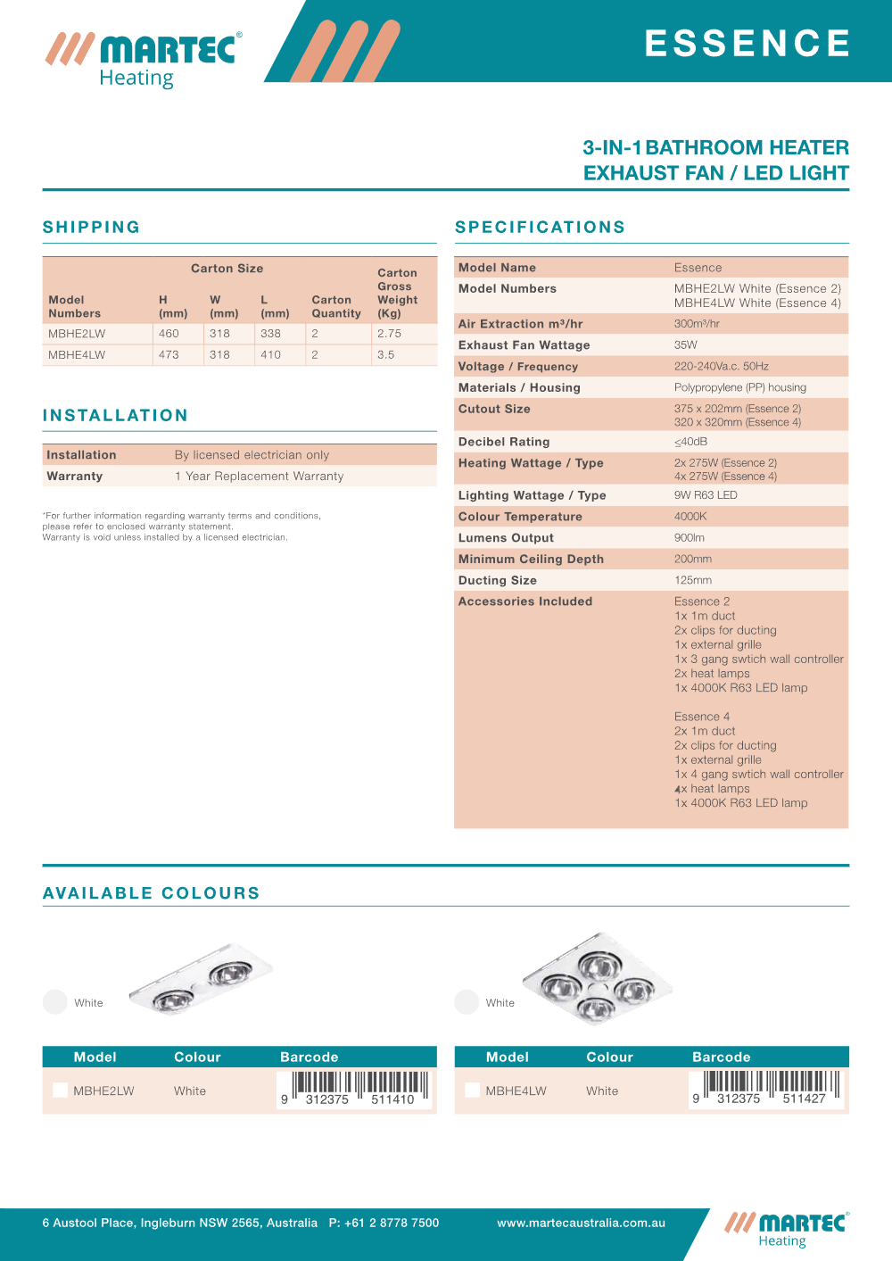 Martec Essence 4 – 3-in-1 Bathroom Heater, Exhaust Fan and LED Light – Fast Shipping from Lights and Fans Online