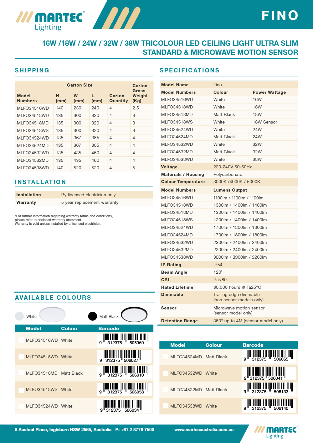 🌐 Sensor Model Option Includes microwave motion sensor with a 360° detection range up to 4 metres — ideal for energy-saving applications.🎛️ Dimming Compatible Non-sensor models are dimmable and compatible with Martec® MTD350VAP & MTD350VAR dimmers (sold separately).