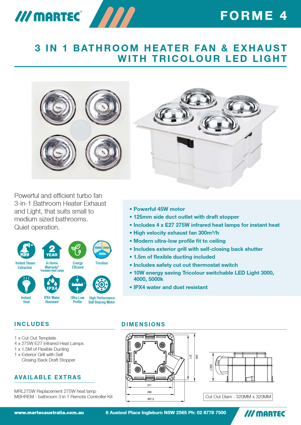 Forme 4 3-in-1 Bathroom Heater with 4 Heat Lamps, Exhaust Fan with Tricolour LED Light