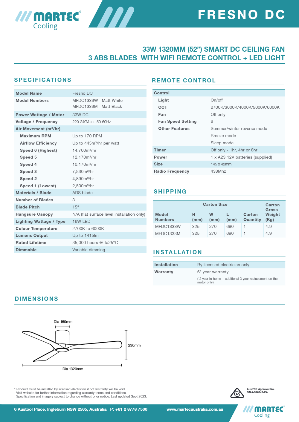 Product Specification alt="Martec Fresno ceiling fan reversible summer and winter mode with 8-speed remote – Lights & Fans Online"