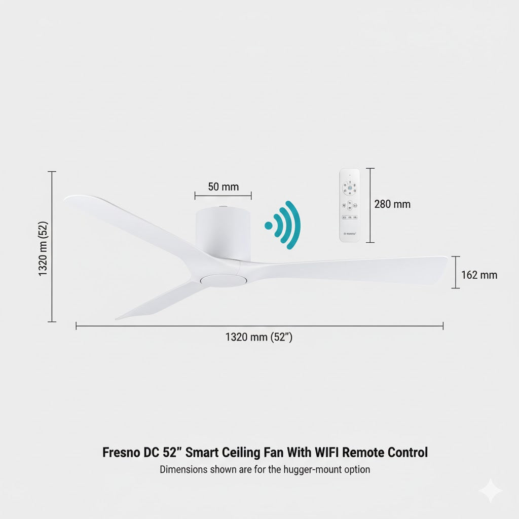 Refresh your home with the stylish and ultra-quiet Fresno DC 52″ Smart Ceiling Fan — designed for modern living, powerful airflow and effortless smart control. With its energy-efficient DC motor, the Fresno delivers smooth, whisper-quiet Cost Saving performance that’s perfect for bedrooms, living areas, dining rooms and covered outdoor spaces.