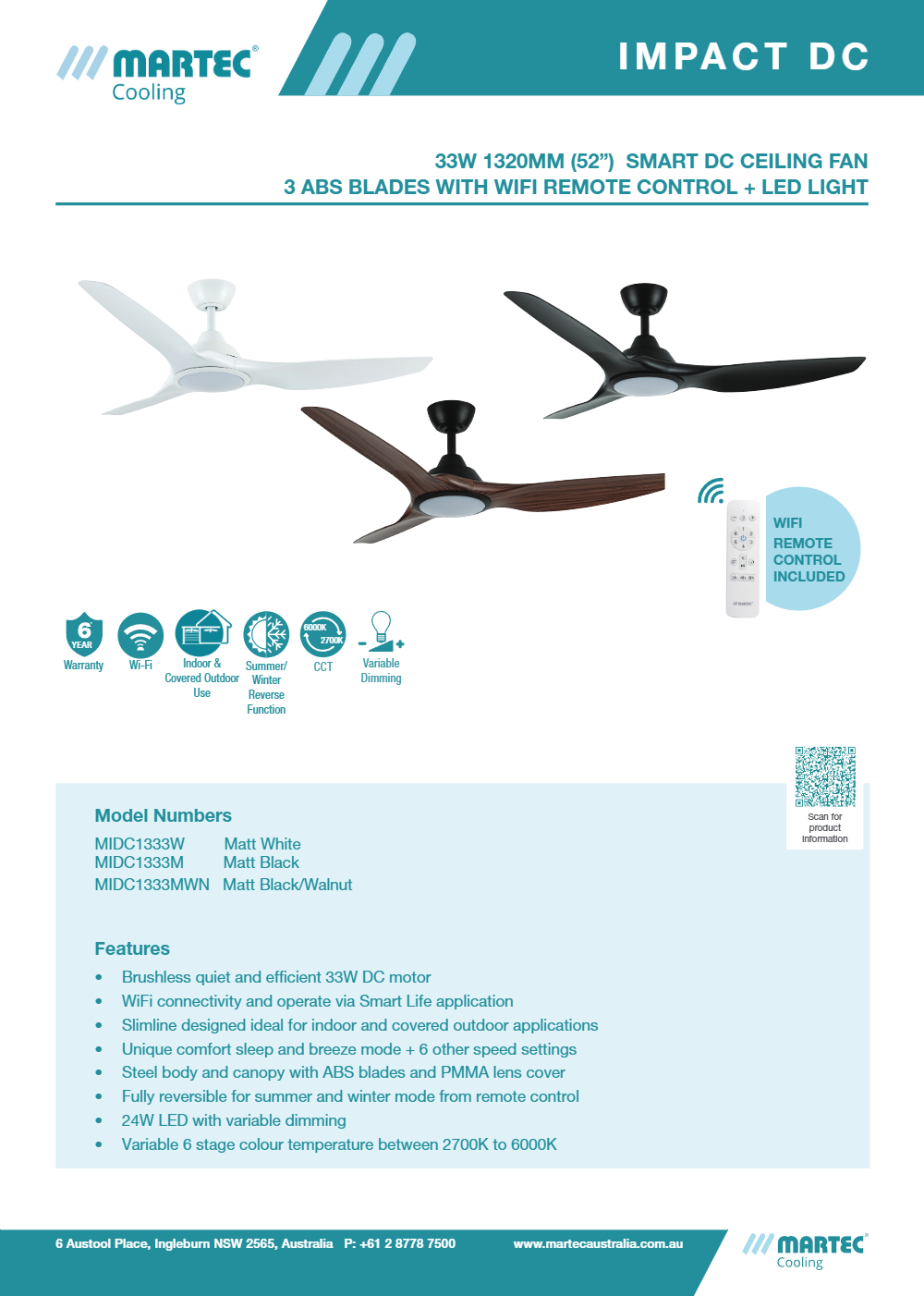 Impact DC 52″ Smart Ceiling Fan With WIFI Remote Control + LED light
