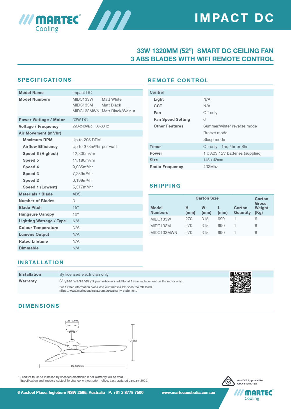 Energy-efficient Impact DC ceiling fan reversible for summer and winter use. White. Lights and Fans online. Martec Australia