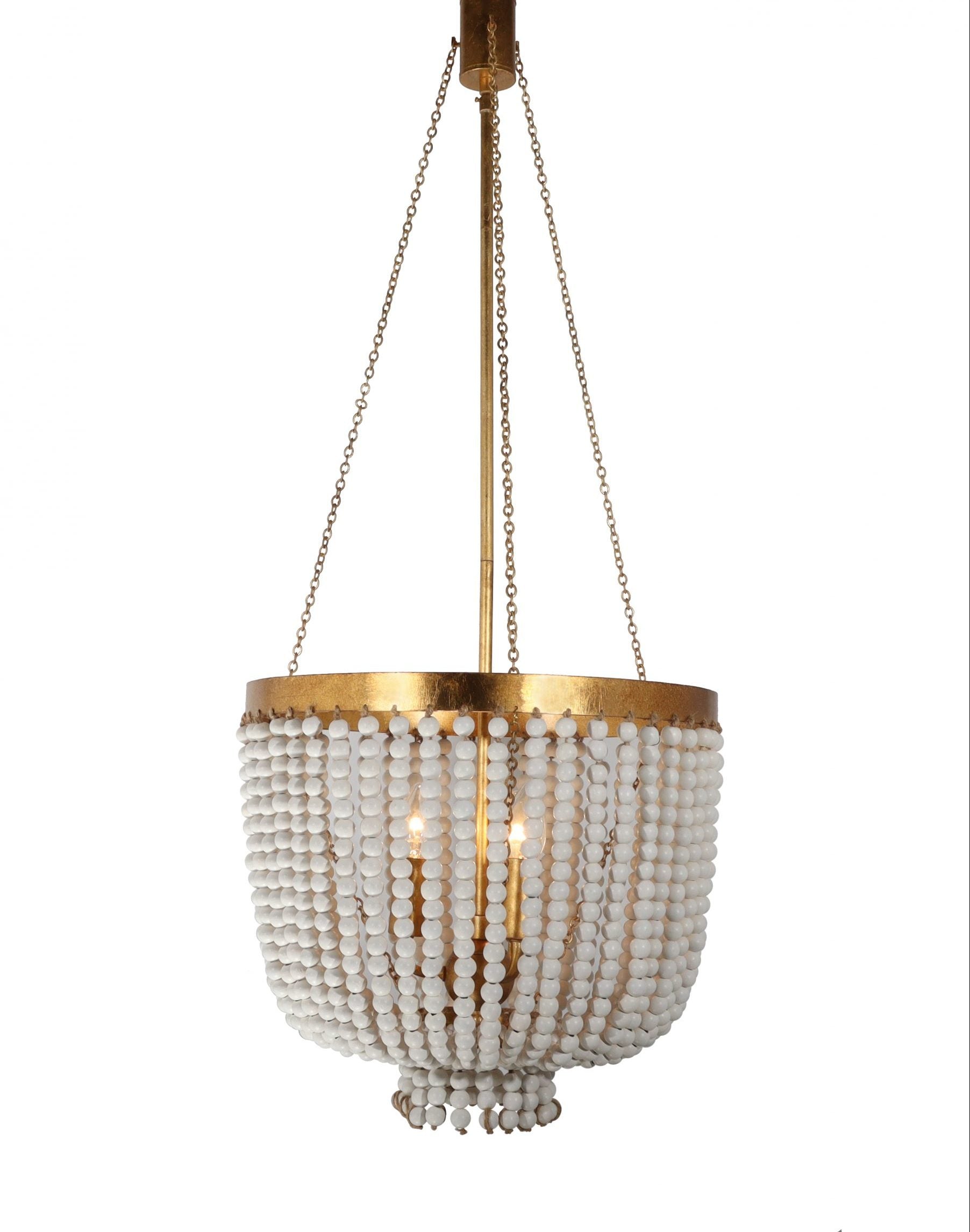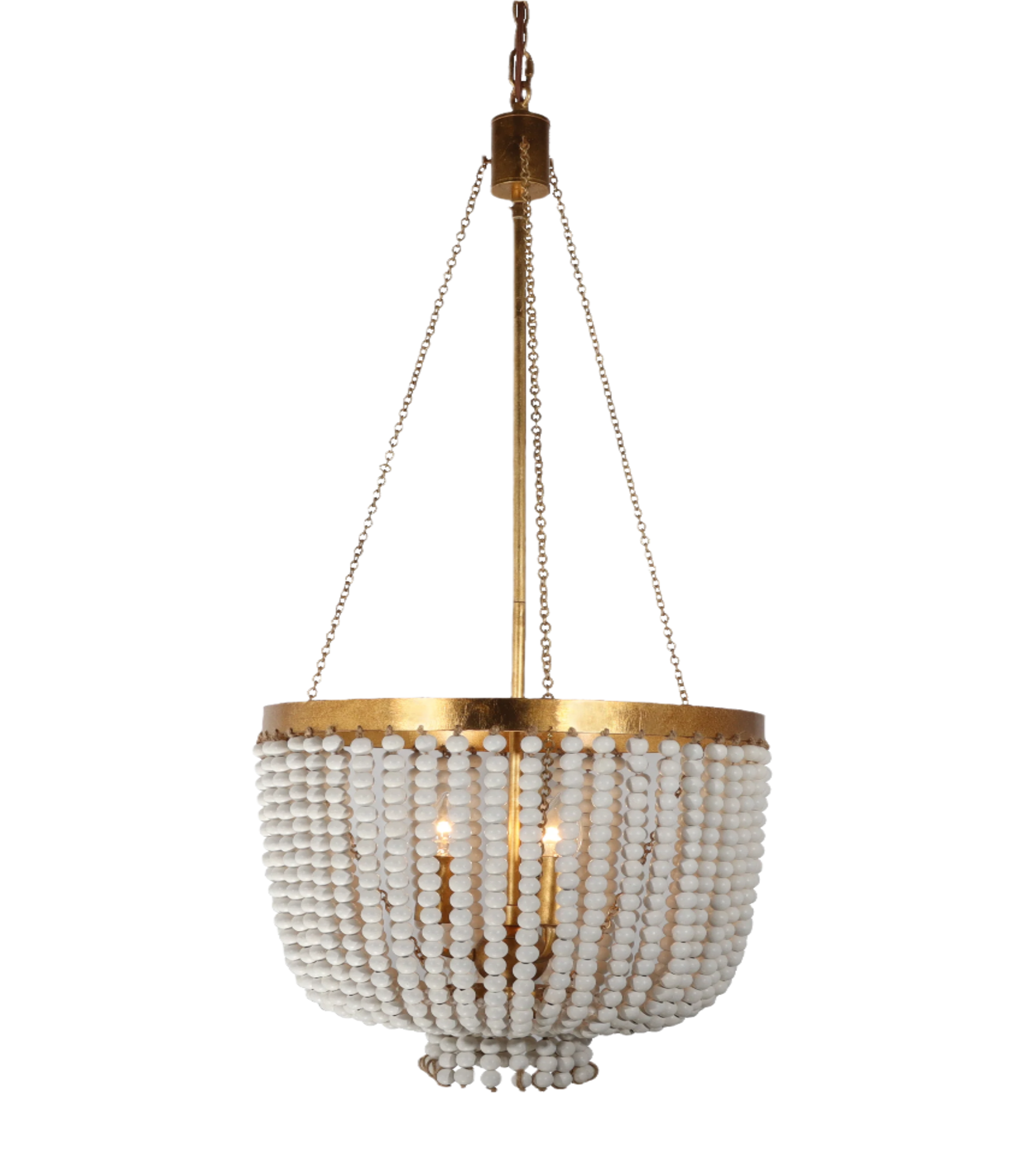 Elevate your space with the Maddison pendant, featuring hand-painted white wash timber beads paired with a stunning aged gold leaf frame.