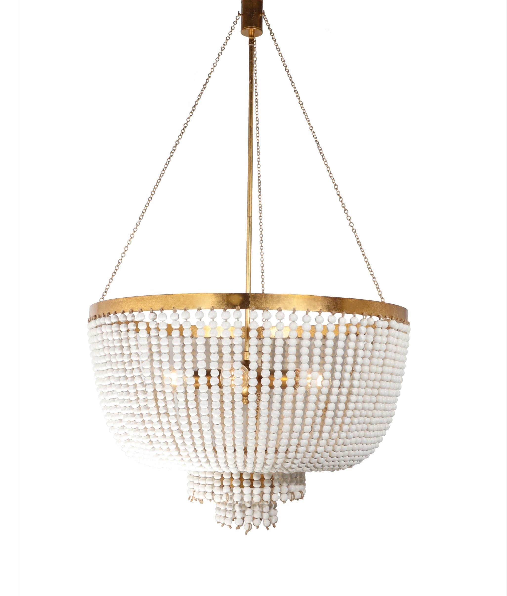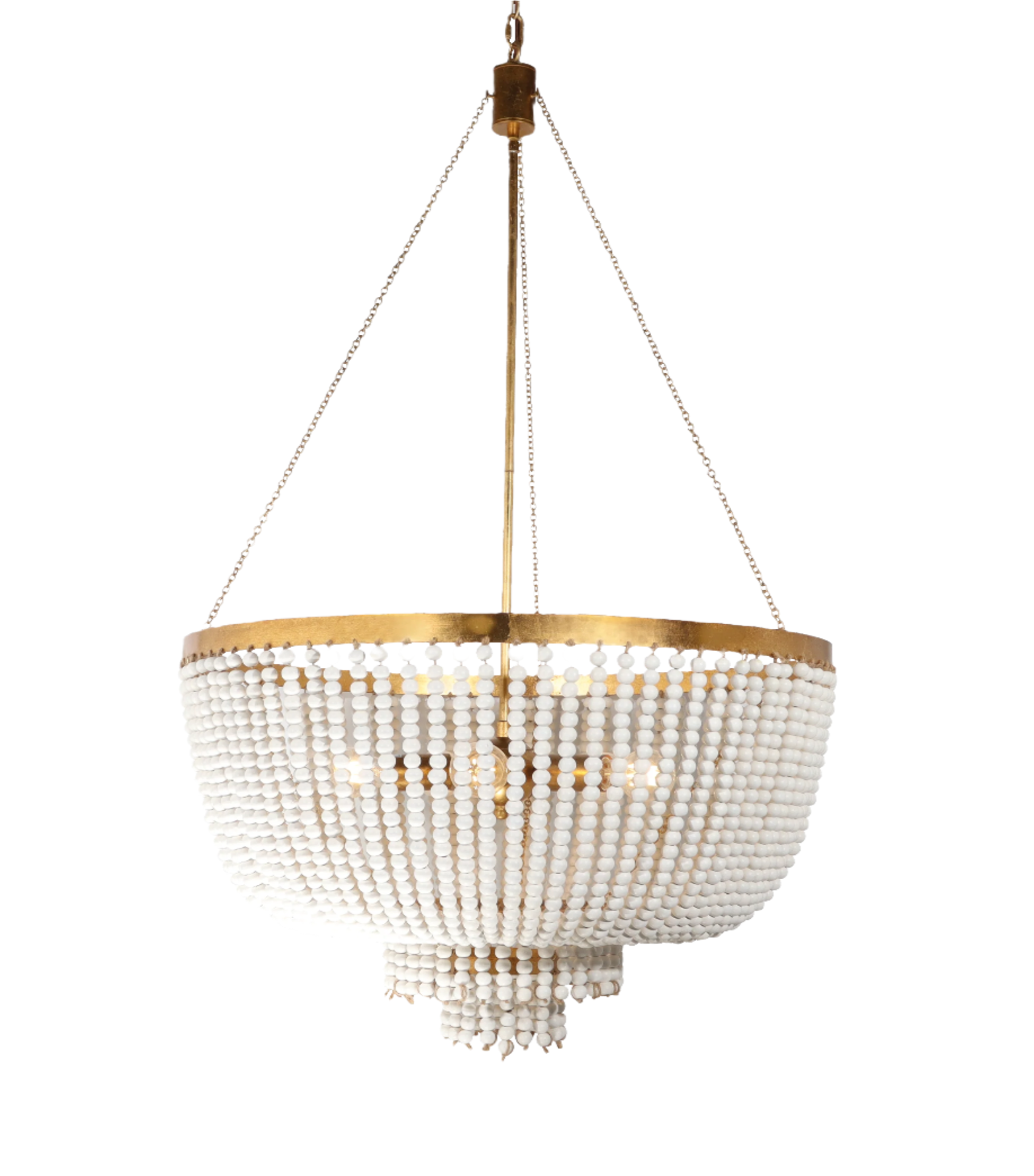 Make a statement with the Maddison pendant featuring hand-painted white wash timber beads elegantly paired with a luxurious gold leaf frame.