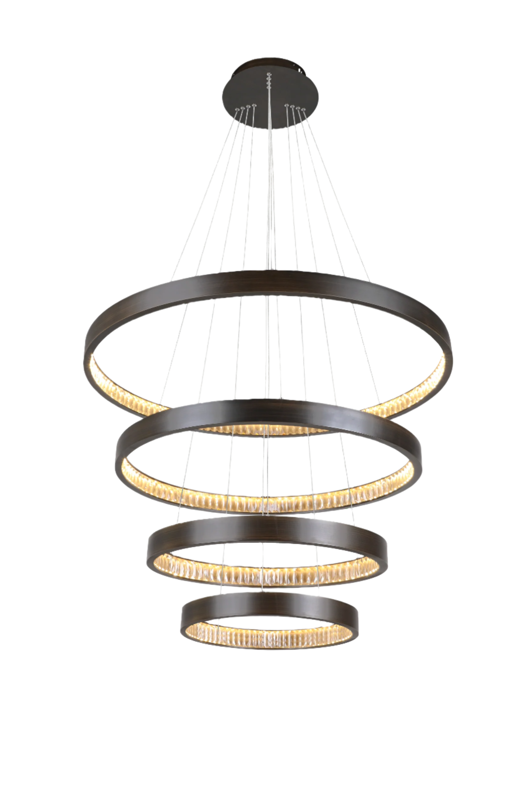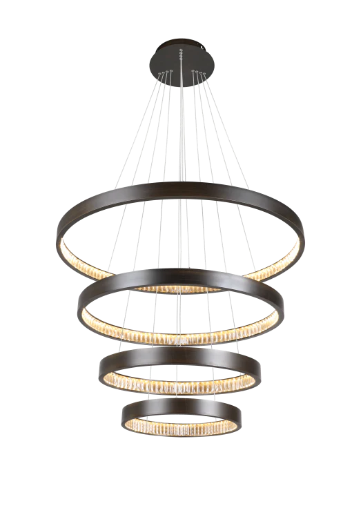 The MARGO Collection’s effortless elegance lies in the details. Featuring four cascading granite-finished aluminium rings (100cm, 80cm, 60cm, 40cm), each one encasing bevelled-cut crystal, this pendant creates a mesmerising display of light — shimmering, reflective, and sophisticated.
