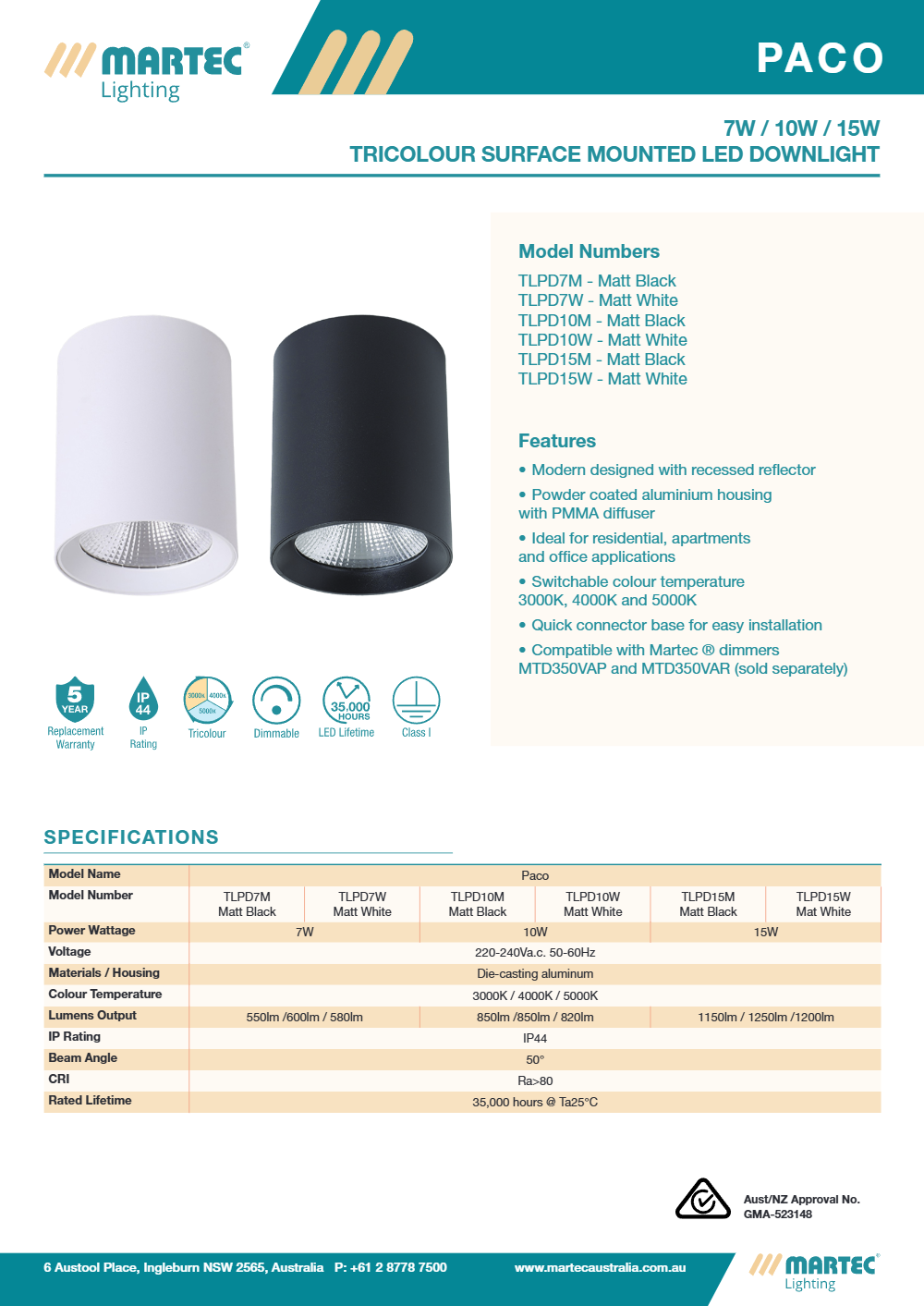 Paco 10W 100mm dia Tricolour LED Surface Mounted Downlight