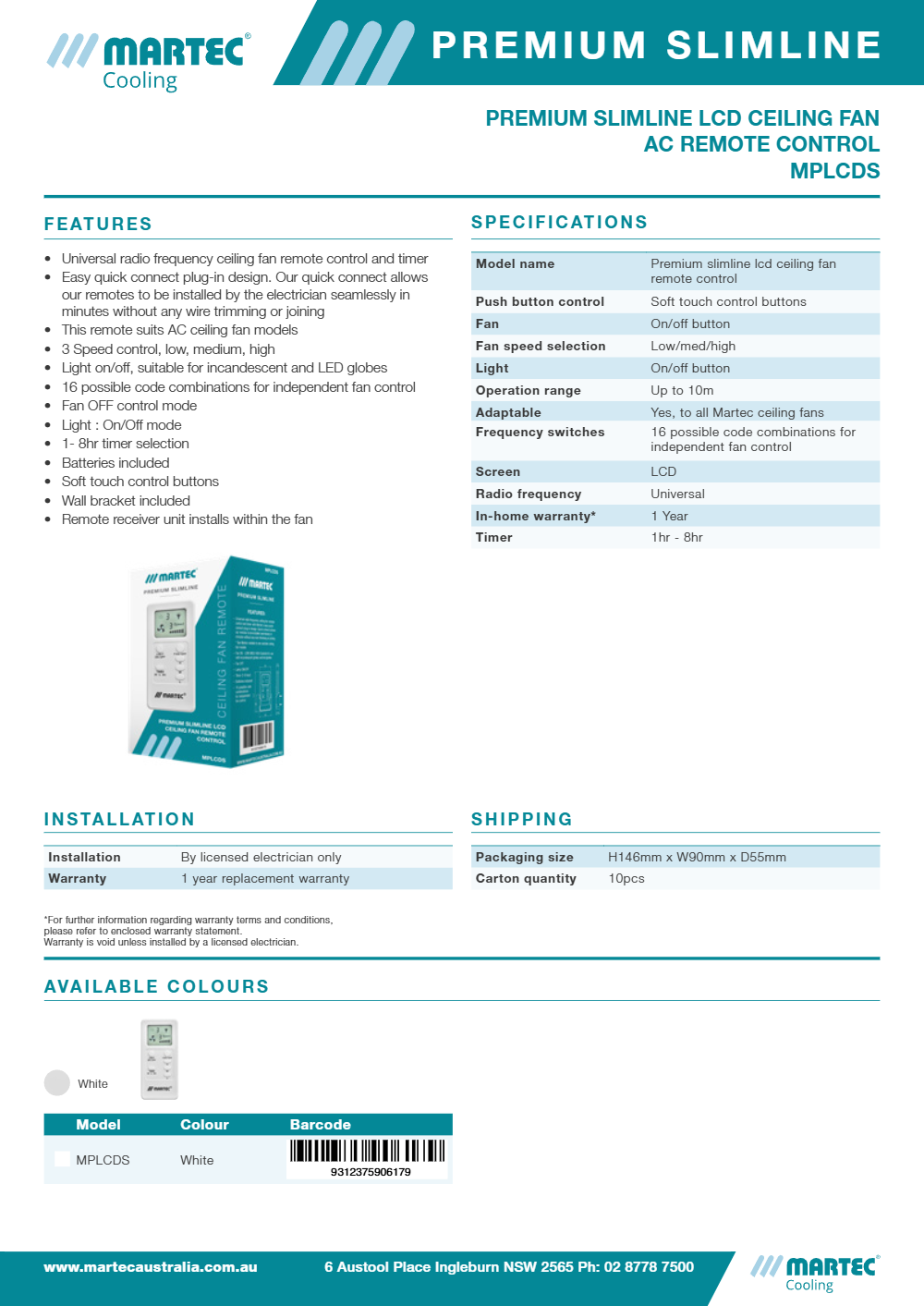 Compatible with most Martec AC ceiling fans, the MPLCDS remote delivers convenience and flexibility, with a slimline design that complements any interior. A wall-mounting bracket is included for easy storage.