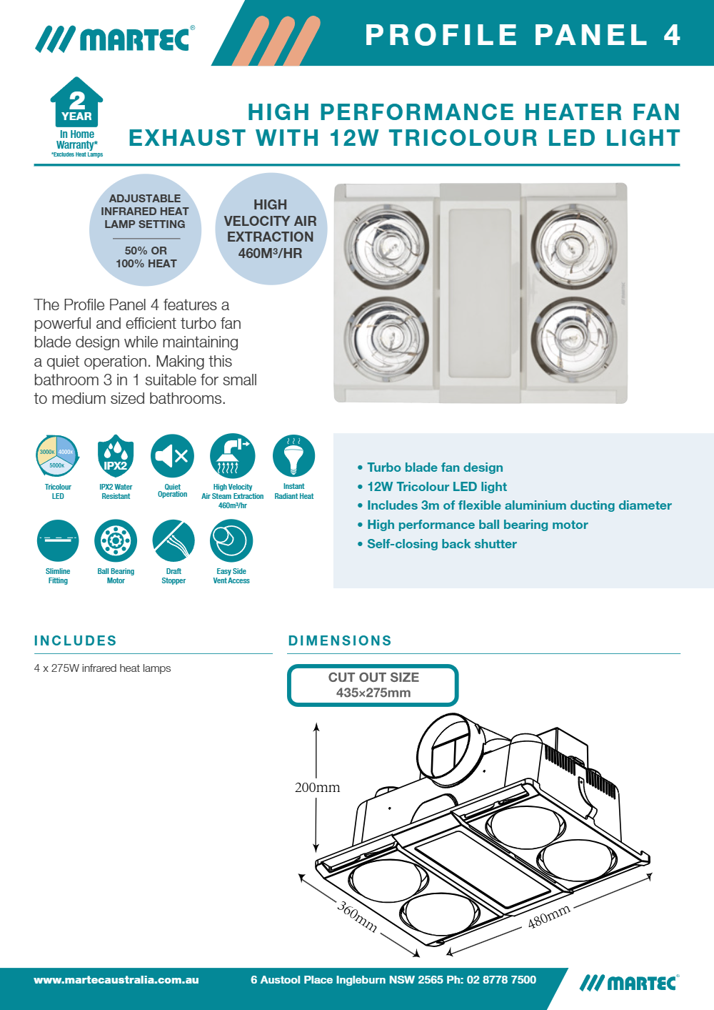 Profile Panel 4 3-in-1 Bathroom Heater with 4 Heat Lamps, Exhaust Fan and Tricolour LED Light