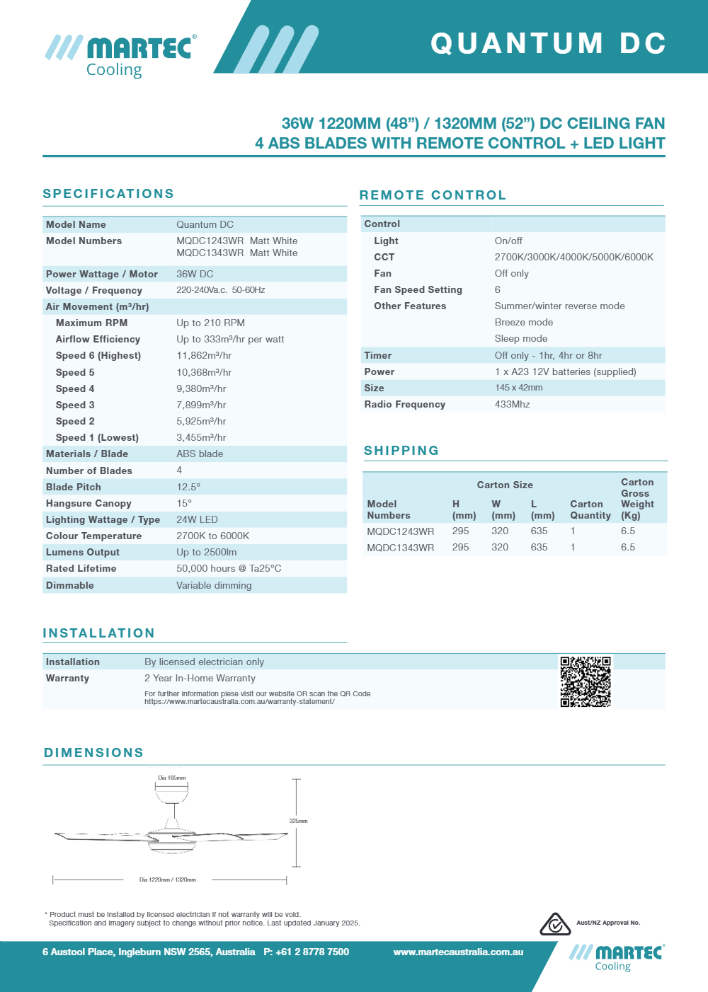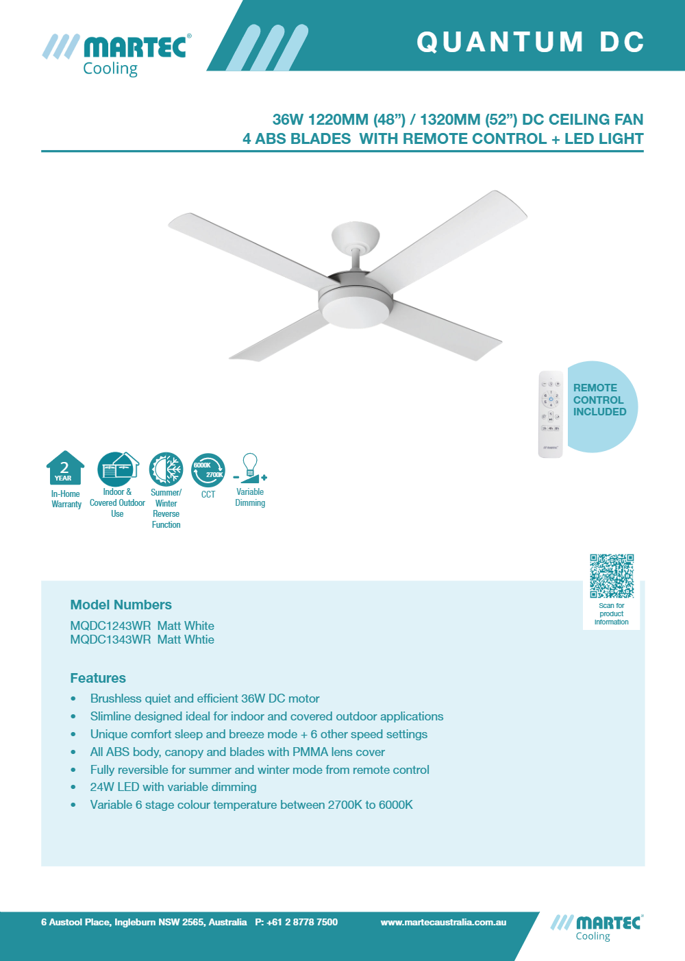 Whether you're cooling your bedroom, living area, or outdoor alfresco, the Quantum DC Fan combines performance and style to suit any modern home.