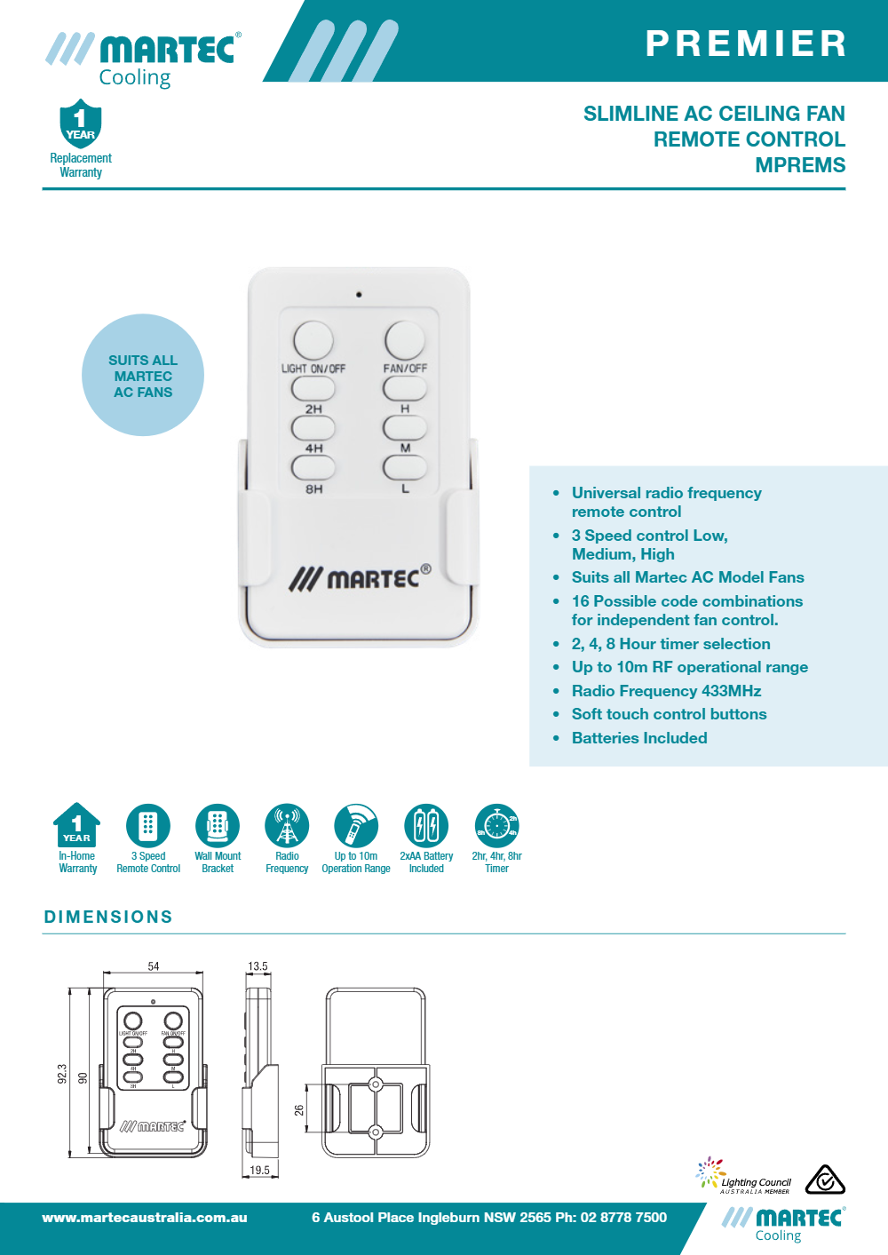 Take full command of your Martec AC model fans with this versatile Universal Radio Frequency Remote Control. Designed for convenience and precision, it lets you customize your fan settings effortlessly.